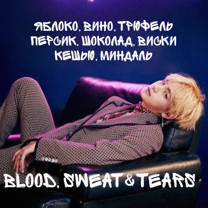 Описание: Аромат раскрывает как текстовые, так и визуальные отсылки в концепции “Blood,sweat&tears”. Blood - кровь(красное вино), также отсылка к бокалам, которые мемберы держат в руках во время пира. Sweat - пот(морская соль). Tears - сладкие страдания(это сладкая основа аромата: сливки, крем,ваниль, персик, шоколад). Причина, по которой в аромате появились крем, персик и шоколад: “Peaches and cream, sweater than sweet, chocolate cheeks, chocolate wings”. Виски - также отсылка к цитате. Мы оставили отсылку к прошлой версии аромата, но значительно усложнили его. Аромат в целом сладкий, но не приторный, как калейдоскоп: может раскрываться как холодными оттенками(лед в нотах), так и сладкими, теплыми, яркими(карамель, красное яблоко, персик, шоколад), нежными(сливки, крем) и даже грубоватыми(трюфель, виски). Все очень зависит от вашего восприятия, кожи, погоды.