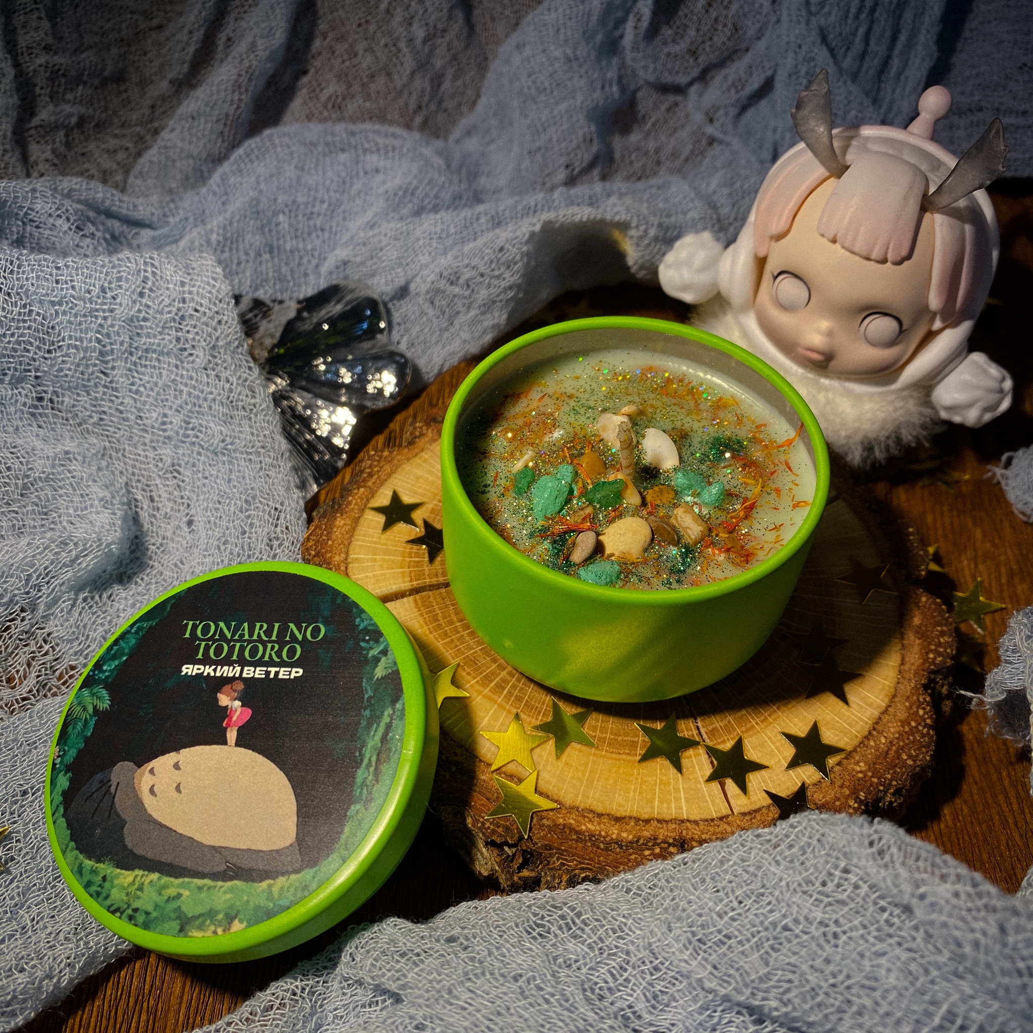 Аромат о любви к семье, природе. Начинается с игривых, ярких нот манго и лимона(отсылка к платьям Мэй и Сацуки) и зеленых нот(они не главные в этом аромате, но они заметно присутствуют как место событий) - это отсылка к первым, ярким дневным нотам, где девочки только переехали в старый дом, исследуют задний двор и наполняют всех вокруг своей неугомонной энергией. Дождь - отсылка к сцене с дождем, когда обе девочки встретили Тоторо и Котобус. Ночная ежевика и хмель - отсылка к ночным путешествиям. Кокосовое молоко - отсылка к нежной заботе всех членов семьи(и соседей) друг о друге. Дуб и амбра - теплая основа, которая остается даже спустя многие часы фоном как уютное одеяло(как и сам мультик я вспоминаю всегда с теплом). Тем более желудей в мультике было... Они обязаны были появиться в аромате(только я взяла именно сам дуб, "мать" желудей).